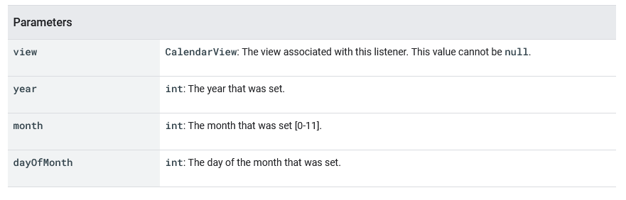 calendar.setOnDateChangeListener(new CalendarView.OnDateChangeListener() {