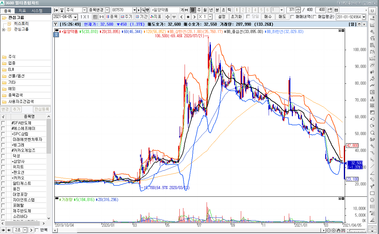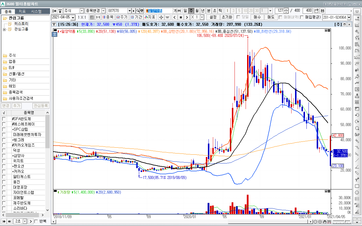 주봉 일봉 차트입니다. 코로나 치료제로 슈펙트를 개발하려고 했으나 임상실패, 효과 입증 미미로 인해서 갭하락이 발생한 것 같습니다.