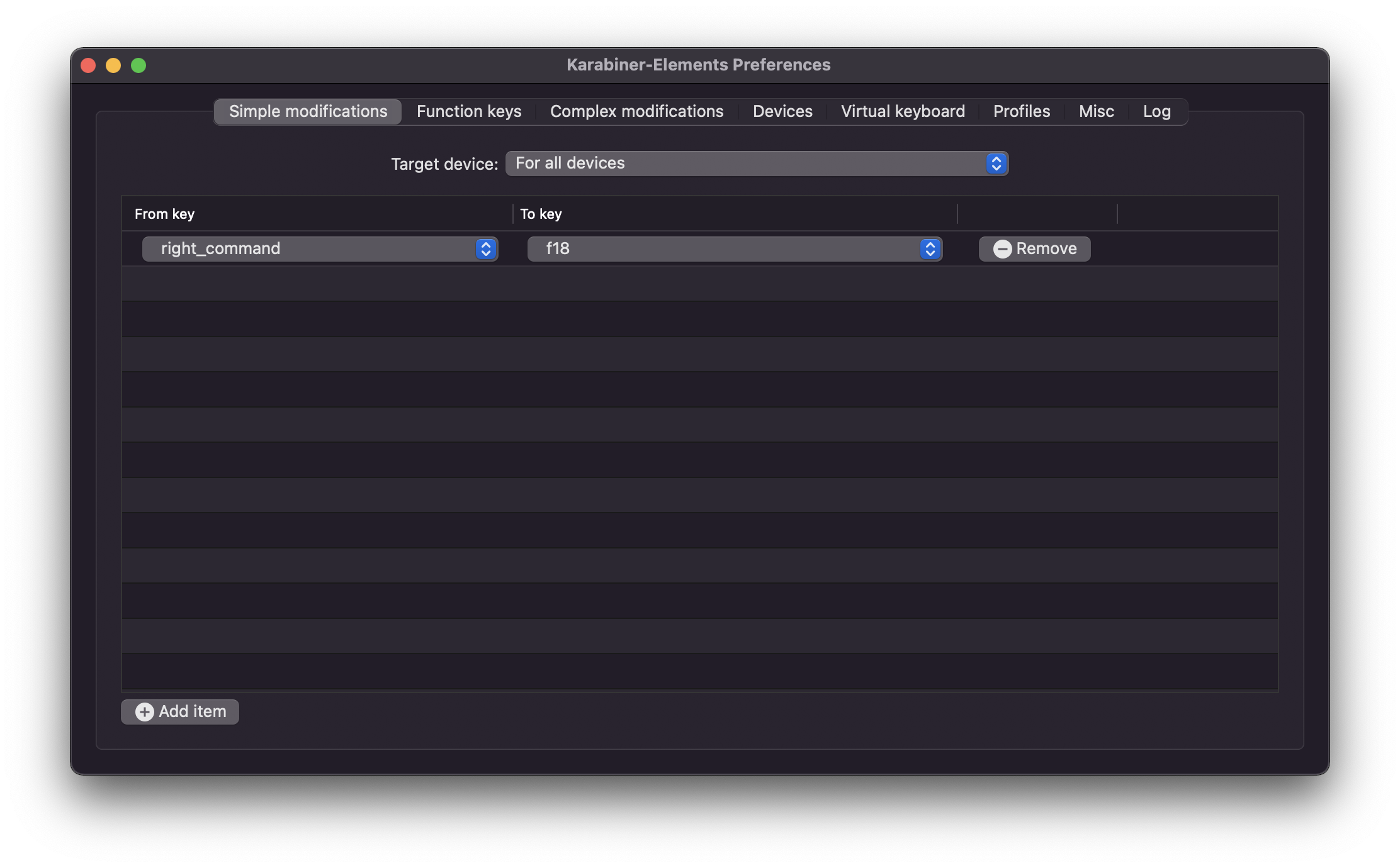 이제 Add item - 왼쪽 칸에 오른쪽 커맨드 키, 오른쪽에 f18을 넣어주시면 돼요