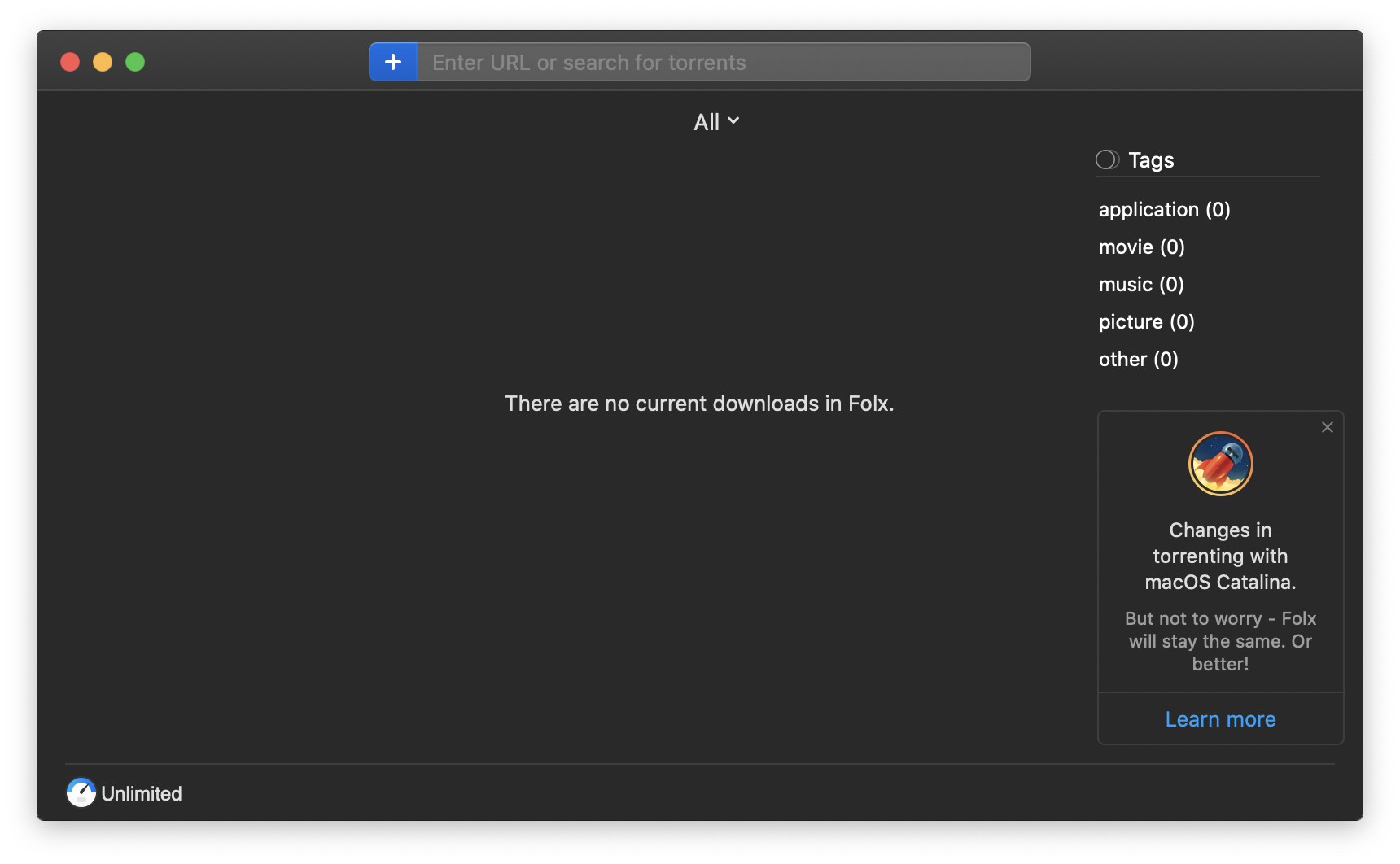 사용법은 간단합니다. 토렌트 파일을 더블클릭해도 되고, 끌어다가 There are no current downloads in Folx에 놓아도 됩니다.