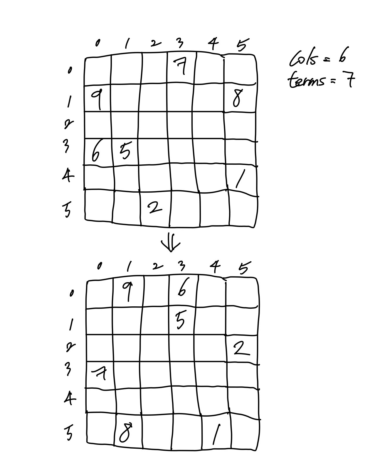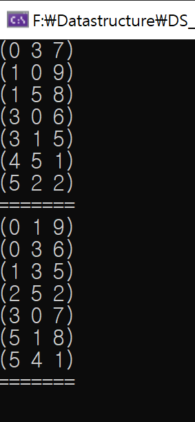 값이 가득 차있거나, 80%이상이 차있는 행렬들은 이렇게 일반적인 방법을 통해 전치행렬로 만들어주면 되지만, 희소행렬같은 경우에는 비용이 너무 많이 발생하기 때문에 다항식 덧셈 두번째 방법에서 사용했던 '항'으로 접근해야됩니다.