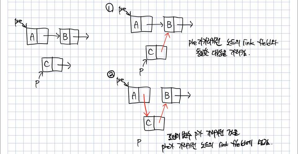 달라진 점은 리스트 중간에 삽입하기 때문에 삽입할 위치에 선행노드를 반드시 알아야한다는 것이죠.