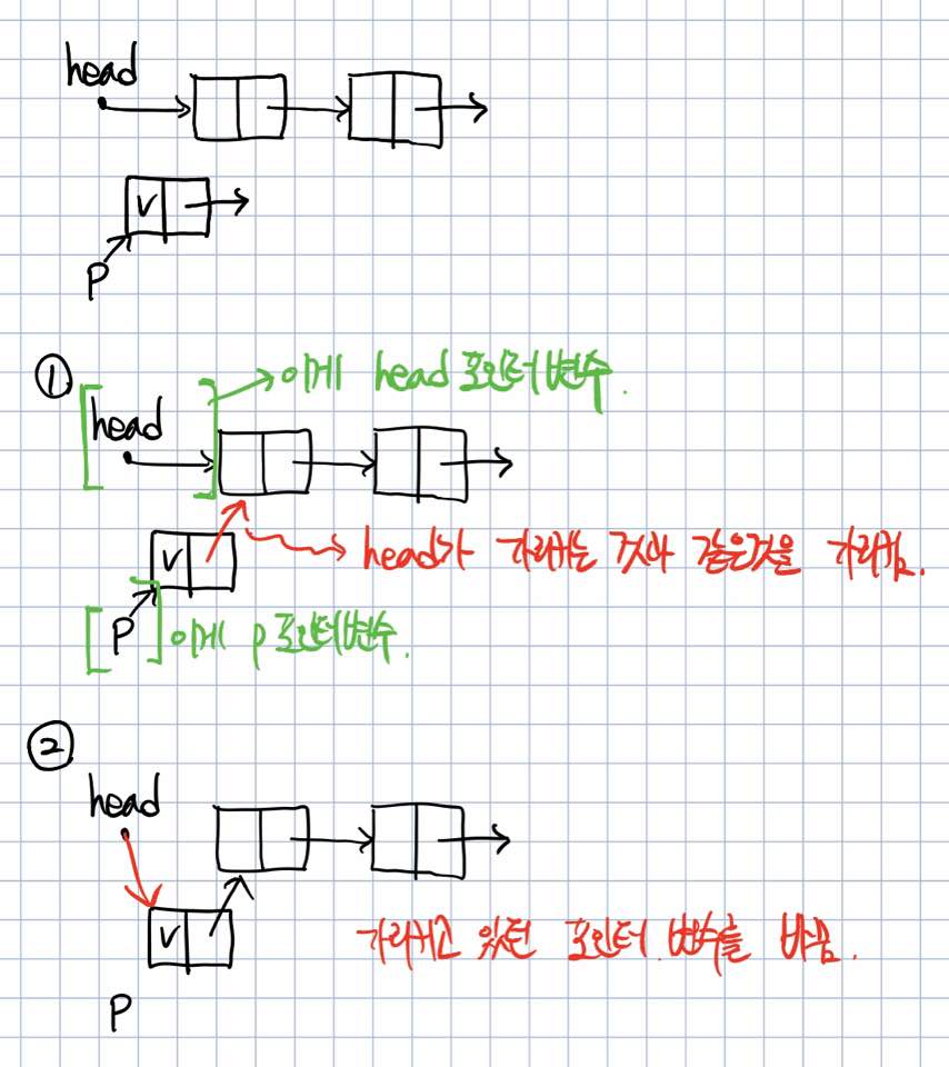 p->data에 삽입될 값을 저장해주고, head포인터가 가진 밧줄을 p->link에게 넘겨줍니다. p->link는 변수 p 가 가리키고 있는 노드가 가리키는 위치입니다.