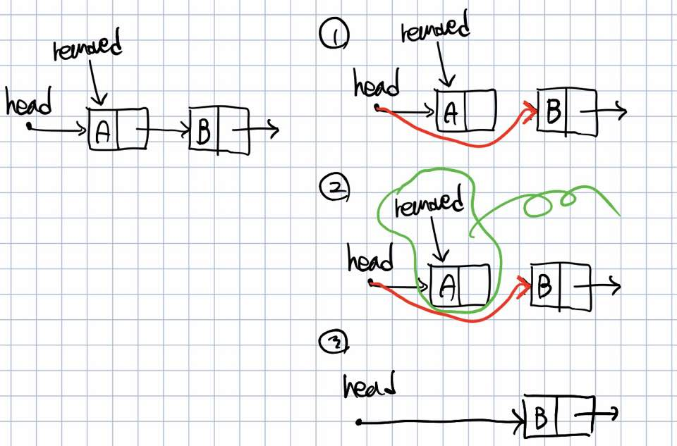 removed가 선행노드가 가리키고 있는 것을 가리키게 하고, removed가 가리키는 노드가 가리키고있는 걸 선행노드의 링크필드에 달아줍니다.